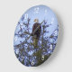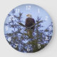 A Bald Eagle perched in a tree majestically surveys his domain. An adult Bald Eagle is perched in the middle of the clock with white numbers. A bit of blue sky near the top peeks through the branches of the evergreen tree. Copyright © 2013 Fred Ziegler
