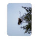 A photograph of an American Bald Eagle perched atop a pine tree.