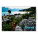 A digital painting of a bald eagle perched on a driftwood log washed up on the rock-strewn coast of Alaska; mountains loom in the distance. Text reading "Alaska" also appears.