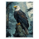 A bald eagle perched on a sturdy branch, its piercing gaze fixed with intense focus. The eagle’s powerful beak and sharp talons are clearly defined, and its feathers are richly detailed, showcasing the striking contrast between its white head and dark body. In the background, a misty forest or rocky cliff fades into the distance, with tall trees rising upward, framing the eagle in its natural habitat. The scene exudes a calm yet charged atmosphere, embodying strength and watchfulness.