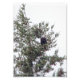 A photograph of an American Bald Eagle in a conifer tree that has many pine cones dangling from it's branches. The mature eagle is perched on a thin limb surveying the landscape. The sky is covered in a light grey cloud, indicating a chilly temperature.