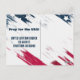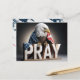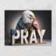 A majestic bald eagle is draped in an American flag, perched above large wooden letters spelling "PRAY."