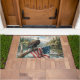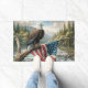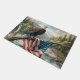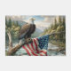 A regal bald eagle on a tree branch overlooking a flowing river with an American flag