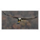 A magnificent bald eagle, photographed with its its wings spread as it carries its fish towards trees behind the photographer.