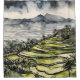 With remarkable attention to detail, every rice terrace is painted with intricate precision, creating a mesmerising tapestry of interlocking shapes and shades. The watercolor medium lends an organic flow to the composition, mirroring the undulating landscape and the gentle sway of the rice plants in the breeze.