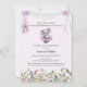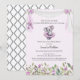 Adorable and whimsical this baby ballerina koala is tutu excited to celebrate a new baby! Dressed in a purple tutu with a matching flower on top of her head. Purple flower border at bottom with a floral held white banner across the top with hanging ballet slippers. Grey/white, elegant, diamond-shape pattern on back. Templates provided.