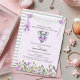Adorable and whimsical this baby ballerina koala is tutu excited to celebrate a new baby! Dressed in a purple tutu with a matching flower on top of her head. Purple flower border at bottom with a floral held white banner across the top with hanging ballet slippers. Grey/white, elegant, stripe pattern on back. Templates provided.