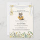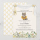 Adorable and whimsical this baby ballerina grey wolf is tutu excited to celebrate a new baby! Dressed in a golden yellow tutu with a pink flower on top of her head. Golden yellow flower border at bottom with a floral held white banner across the top with hanging ballet slippers. Golden yellow/white, elegant, diamond-shape pattern on back. Templates provided.