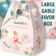 Ballet-themed girl Birthday party large gable favour boxes with a cute little ballerina with blonde hair, balloons, and flowers in soft shades of pink, teal and cream. You can choose from 3 sizes of these gable favour boxes. Easily personalise the text or leave some of it blank - Kate Eden Art