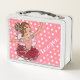 Fun bright red and pink with polka dots pretty ballerina girl named id lunch box. Perfect for dancing dark hair girl to take to school or ballet classes. Customise with your child's name. Currently reads Imogen. Illustrated and designed exclusively by Sarah Trett for www.mylittleeden.com