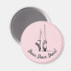 Choose your own background colour and text on this dancing-themed magnet. Shown here in pale pink, it features a ballerina's feet in ribboned pointe shoes as she dances on her toes. The slogan says 'Dance, dance, dance!' but can easily be personalised with a name or brand. A fun, modern graphic for a dancer or balletomane, with a classy engraved effect.