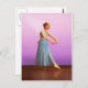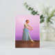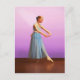 A demur young ballerina strikes a graceful pose on a background that ranges from pink to purple. Her head is slightly bowed and there are flowers in her hair. She is wearing a flowing blue dress. Customise by adding your own caption to the image.