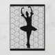 A silhouette of a ballerina posing on the tips of her toes with her hands raised above her head. The background is a heart and flower shaped mandala pattern. Surrounded by a black border.