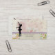 Business card template with a silhouette of a ballerina on a pretty background. This elegant ballet dancer is standing on her toes, en pointe with her arms outstretched gracefully. The background is composed of a shabby vintage looking pattern with flower blossoms. Along the bottom of the card is an old fashioned clock and a floral bouquet.
