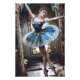 Ballet dancer wearing a blue and gold tutu in the middle of dancing.