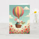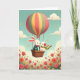 This design shows two friendly, human-like animals sharing a close moment in a hot air balloon, with the long-eared one in a green jacket and red bow tie leaning toward a fluffy white, bird-like companion with an orange bill. The bird wears a striped scarf in warm green and yellow tones, and a small red accent near its eye adds a flirty touch to their gentle, side-by-side pose 🐰. Above them, the balloon fills the upper area with wide vertical stripes of red, golden yellow, and deep olive, all tied to a woven basket that looks sturdy and detailed. Along the lower portion, a rolling field of red and pink poppy-like flowers is dotted with small yellow blooms, making the scene feel like a shared spring outing 🌷. The sky is a calm blue with soft light, and scattered white clouds drift behind the balloon to frame the pair’s quiet closeness. A short Easter greeting sits near the top in a light color, with a smaller line of text near the bottom in a matching tone for balance. Tiny golden stars are sprinkled around the clouds in the blue sky.