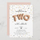 Adorable party invitation's for your little one's second birthday feature "ONE" spelled out in rose gold balloons, on a background of rose gold, gold and black confetti. Personalise with your two year old's birthday party details in a combo of whimsical and modern lettering. Invitations reverse to solid blush pink.