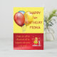 Sweet cartoon animals on red background and balloons on yellow background. Cute birthday card for babies birthday. Customise name and description.