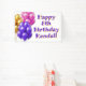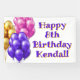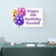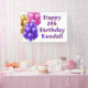 Birthday party banner sign to hang on the wall for a girl's party. Purple, pink and gold bunches of balloons decorate a large sign with "Happy (age) Birthday (name)" wording. Add festivity to the party decor with a sign that is sure to please children of all ages. Signs come in fabric for indoor or outdoor hanging. Some other sizes may work, but keep wording away from the edges.