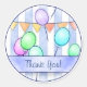 A watercolor and ink design in soft pastell tones, featuring colorfull balloons raising into the air over a blue and white striped background with red and yellow bunting and a blue ribbon. Text on the ribbon can be personalised.