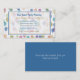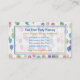 Here's a fun business card that event and party planners will like. The background is a pattern of blue, gold, green, and pink balloons floating on a white background. A semi-transparent white centre rectangle holds your business information in blue and gold. The back of the card is solid matching blue with an extra text field in white if you need it.