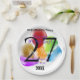 Paper plates, personalised for a birthday with balloons as background. Day, month, year, "Happy Birthday!", name, "wishing you the best", and the year. Coordinating giant gift card, paper cups, paper plates, paper napkins, gift wrap and other items sold separately. Designed by HAMbyWhiteGlove
