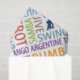 Ballroom dance colourful word art design with image of a couple ballroom dancing and fun lettering for dance styles like rumba, foxtrot, waltz, cha cha, samba tango, jive and swing.