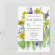 A cheerful wedding invitation decorated with a border of bright yellow balsamroot and purple lupine wildflowers hand sketched with pencil and painted with watercolor. On the reverse is a light shade of grey. Customize the invitation with your details.