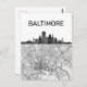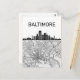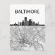 The city skyline of Baltimore, Maryland including landmarks with the map of Baltimore underneath.