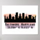 Wall print features Baltimore Maryland city skyline silhouette with watercolor splash and latitude & longitude map coordinates