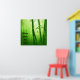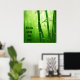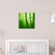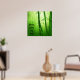 Text which says - silence calms my soul. With a lush emerald green image of bamboo stalks with long delicate leaves and pale bokeh lights in the background.
