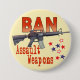 Artwork of type of assault rifle used at elementary school in 2012 with large type "BAN Assault Weapons". Large 4" button, available also in various shapes and sizes, T-shirts for men or women and bumper stickers . Discounts for multiple orders. Design by Balance America.