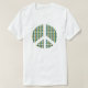 A t-shirt for peace, with a repeat pattern of the ban the bomb symbol. The peace symbols are coloured yellow, blue, red and green.