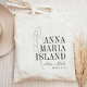 Welcome guests to your destination wedding with these chic and modern personalised tote bags. Design features a dark green tropical banana leaf illustration with your wedding destination aligned at the right (shown with Anna Maria Island) in classic serif lettering. Add your names beneath in handwritten cursive script, as well as the year. Leaf position can be adjusted, and colours can be changed to match your wedding colours using Zazzle's design tool.