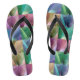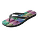 The original pattern on these wide strap Flip Flops was made from original photographs by ZoeSPEAK of banana leaves on a tree in the garden. The photos are closeups, showing the ribbed patterns of the leaves as they curve around each other in the sunlight. The photos have been tinted with a variety of muted colours, sheer greens, blues, browns and purples. The seams where the photos meet have slightly wavy edges, as if stitched together like a quilt.
