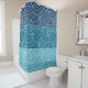 This shower curtain features an illustrated, abstract white line, flowing repeating pattern design that resembles ocean waves or seashells. The background colour is three bands of blue - navy, turquoise, aqua. Perfect for beachy, coastal or ocean theme decor.