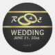 Black and gold elegance! The small circular, embossed pattern and two gold horizontal bands are the background for the featured wedding bands.