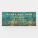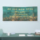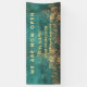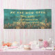 Luxury we are open banner Vintage style gold and emarald green background with script typography and address option . Perfect elegant minimalist emarald green gold address label for nail tech, makeup artist, hair stylist, Coaches & consultants.