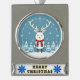 Playful cartoon reindeer wearing a festive scarf, surrounded by a snowy winter scene with snowflakes and decorated trees, evoking holiday cheer and the joyful spirit of Christmas.