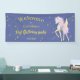 Banner welcome to the first birthday with the image of a gentle unicorn with wings on a blue starry sky.