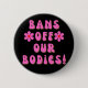 Pro-choice support word art pin back button features "Bans off our bodies" protest text in retro pink style font.