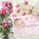 A modern and elegant baptism thank you card. A blush pink background decorated with a pink rose floral, greenery and butterflies. Personalise and add your photo of the child inside the arch frame, thank you note and name.
