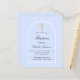 A light blue background and an arch frame. Personalise and a name and ceremony details. Elegant hand lettered style script.