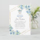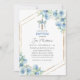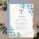 Celebrate your little one's special day with this beautiful Baptism invitation, featuring an elegant draped cross and geometric gold frame, and adorned with soft blue floral accents. Perfect for boys' baptism ceremonies, this design blends traditional religious elements with a modern, fresh look. The delicate blue florals and minimalist details create a timeless invitation that sets the tone for a meaningful and joyous occasion. Personalise with all the event details to invite friends and family to share in this sacred milestone.