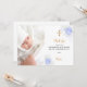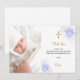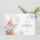 A modern and elegant baptism thank you card. A chic white background decorated with blue and white florals, flowers and a golden cross. Personalise and add your photo of the child, thank you note and name.