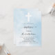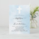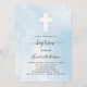 A modern, elegant baptism, celebrating a baby boy. A light blue sky as background, decorated with a white cross. Personalise and add a name and details. Black coloured letters.