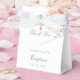 Chic white background decorated with watercolored pink and rose gold coloured roses, florals, flowers, eucalyptus greenery. A golden cross. With the text: Baptism and Thank You written with a modern black coloured hand lettered style script. Personalise and a name and a date.
