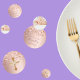 A blush, rose gold faux metallic, foil looking background decorated with rose gold faux glitter dust. Personalise and add a date and name/event. Dark rose gold coloured letters. Some confetti chips with name and date, others with a cross. Add your own photo on two of the chips.