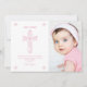 This modern Baptism, or Christening, Thank You Card features an elegant illustrated pink and white floral cross as well as a photo area. A quick and easy way of thanking guests for joining a girl's religious celebration, it can be customised with your child's name and a personal note. The background colour can also be changed to your liking.