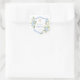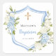 A white background. Decorated with a pink crest, blue and white flowers, florals. With a golden cross.